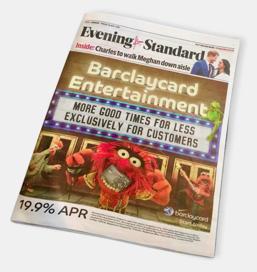This was the largest campaign I created while working in-house at Barclaycard for OLIVER Agency. Working closely with the Barclaycard client team - and the Disney team in LA - we developed an integrated campaign to launch their Barclaycard Entertainment package of customer benefits, including 96 & 48 sheets, digital OOH, digital ads on the tube, an Evening Standard wrap, press, email, experiential, banner ads and the Barclaycard Entertainment website itself. Also notable for the first time I can legitimately say that I brought a campaign to life with the help of a bunch of Muppets.